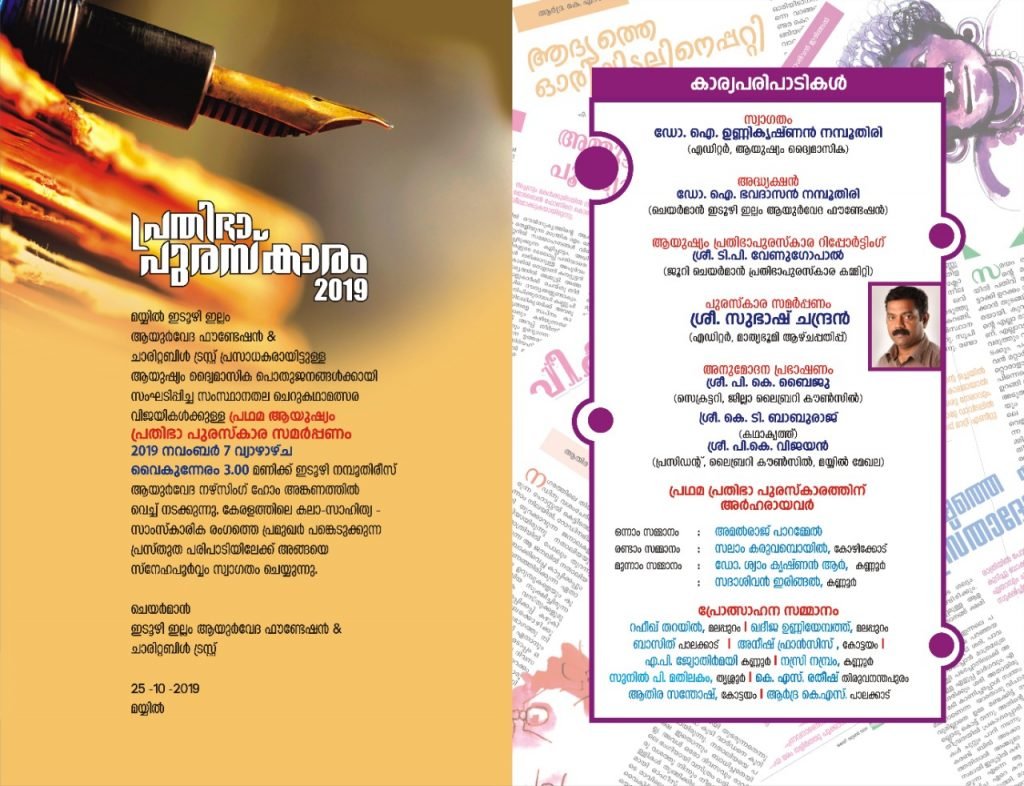Itoozhi Illam Ayurveda Foundation & Charitable Trust proudly announces the Award presentation & felicitation of the 1st state-level ‘Ayushyam – Prathibha Puraskaram’ for the Best Short Story Writer in Malayalam, on 7 November 2019, at 3.00 pm at the Itoozhi Ayurveda Campus.