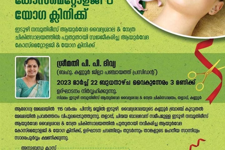 Itoozhi Namboothiri’s Ayurveda Vaidyasala & Nethra Chikithsalayam is proud to announce the opening of Itoozhi Ayurveda Cosmetology and Yoga Clinic at Talap, Kannur
