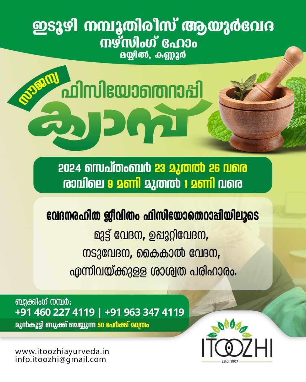 Itoozhi Ayurveda is happy to announce free medical camps for expert health checkups and consultations. Don’t miss this opportunity to prioritize your well-being. All ages welcome!