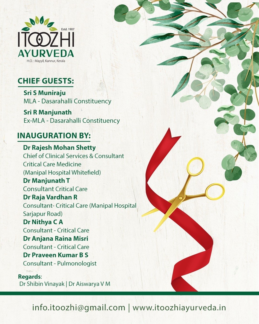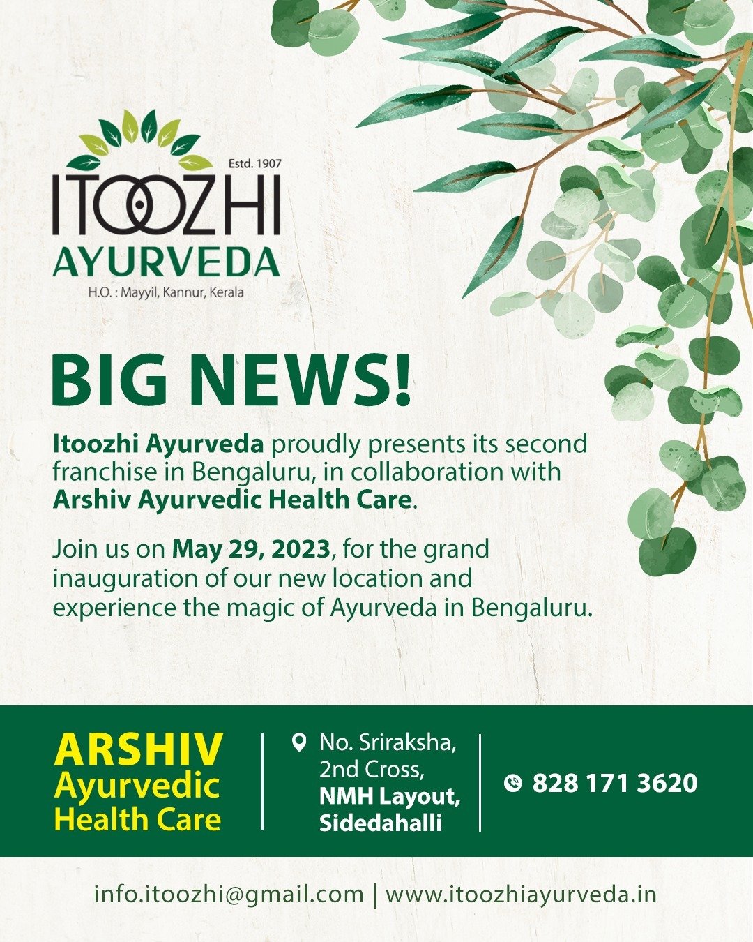 Itoozhi Ayurveda is proud to announce the opening of its second Itoozhi Ayurveda Clinic in Bengaluru. Situated in Sidedahalli, we are happy to collaborate with Arshiv Ayurvedic Healthcare; to bring to you, the finest treatments in traditional Ayurveda. Opening on 29th May 2023, the inauguration will be attended by prominent personailities in the medical and public service fields.