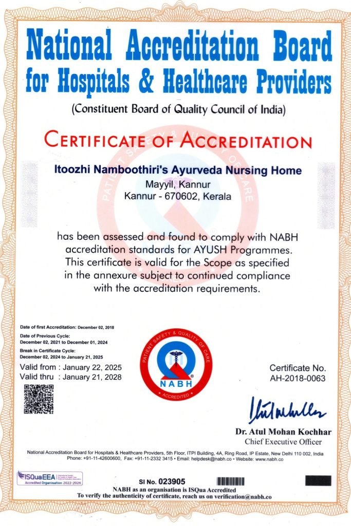 National Accreditation Board for Hospitals and Healthcare Providers (NABH) is a constituent board of Quality Council of India (QCI), set up to establish and operate accreditation programme for healthcare established continuous quality improvement and patient safety. The board while being supported by all stakeholders, including industry, consumers, government, has full functional autonomy in its operation. Accreditation of AYUSH Hospitals, of which Itoozhi Ayurveda is a new initiative of NABH.