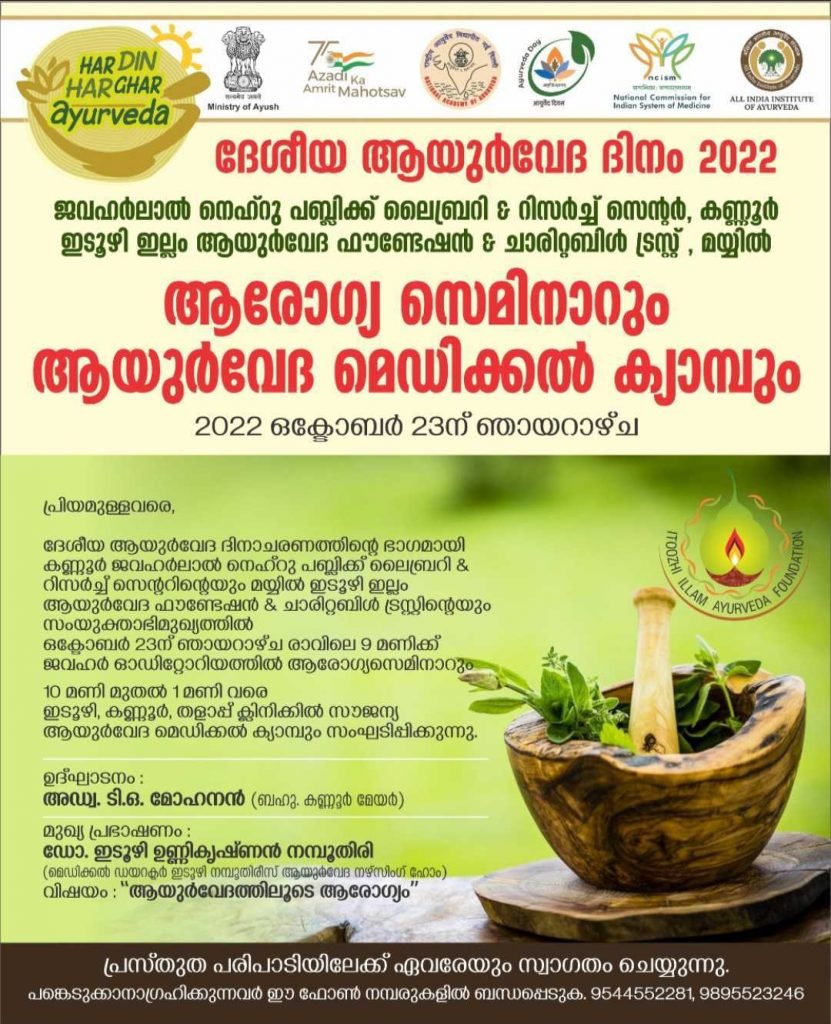 Itoozhi Illam Charitable Trust, Mayyil in collaboration with Jawaharlal Nehru Public Library and Research Centre, Kannur will celebrate World Ayurveda Day on 23rd Oct 2022. We will conduct an Ayurveda Seminar, along with a free Ayurveda medical Camp on this occassion.