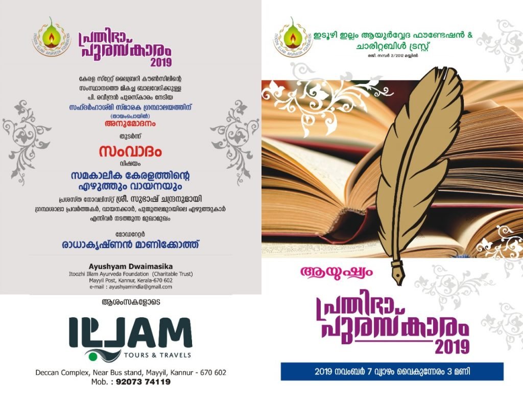 Itoozhi Illam Ayurveda Foundation & Charitable Trust proudly announces the Award presentation & felicitation of the 1st state-level ‘Ayushyam – Prathibha Puraskaram’ for the Best Short Story Writer in Malayalam, on 7 November 2019, at 3.00 pm at the Itoozhi Ayurveda Campus.