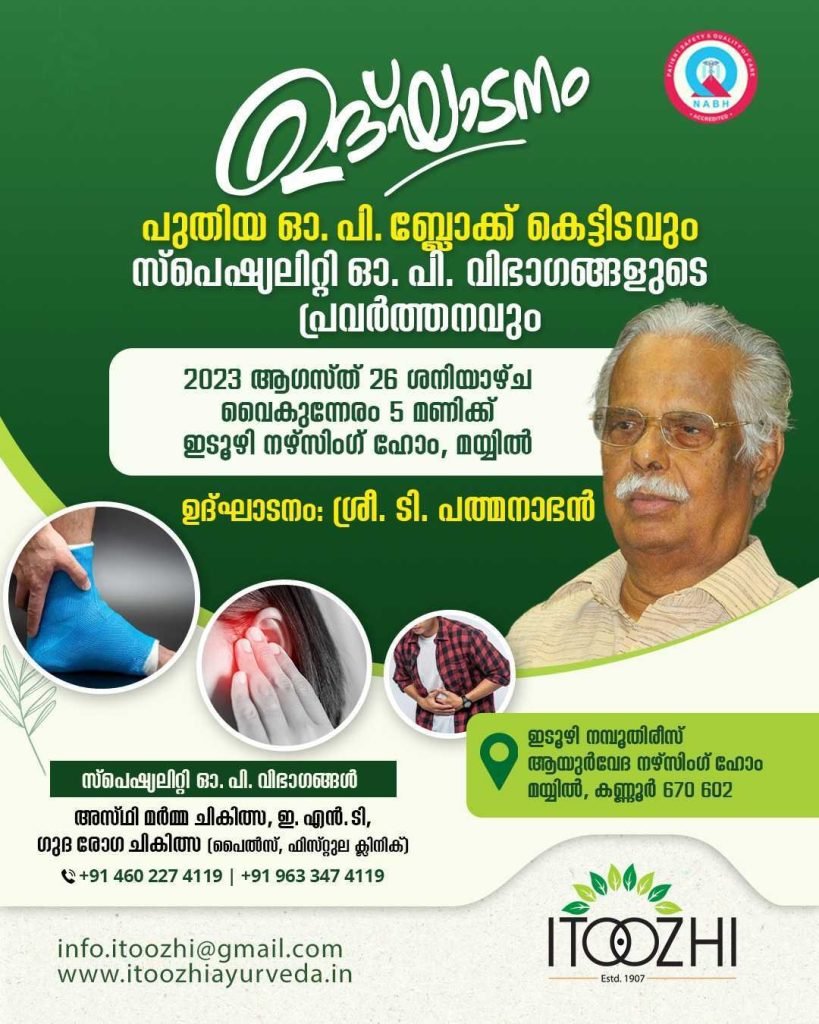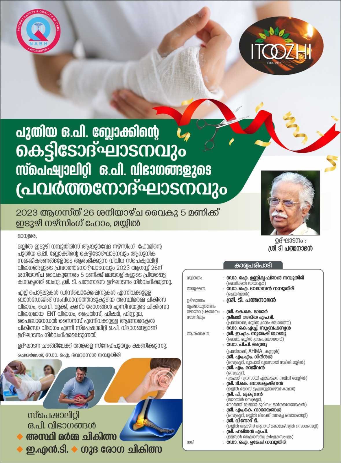 Itoozhi Nursing Home invites everyone for the inauguration of our new O.P block along with inauguration of our ultra-modern speciality services departments on Saturday, 26th August, 2023. The inauguration shall be done by author and eminent literary personality Shri T Padmanabhan.