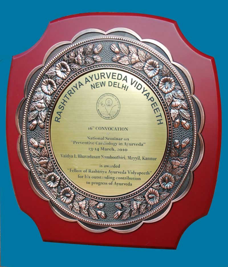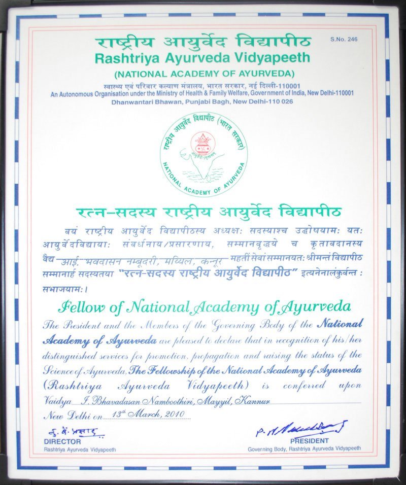 In recognition of his distinguished services in propagating, promoting and raising the status of the science of Ayurveda, Itoozhi Vaidyar Dr. I. Bhavadasan Namboothiri, our Chairman and guiding light of the Itoozhi House of Ayurveda, was conferred the prestigious Fellowship of the Rashtriya Ayurveda Vidyapeeth (The National Academy of Ayurveda), on 13th March, 2010. The RAV Fellowship was conferred during the 16th convocation of the RAV, with “Preventive Cardiology in Ayurveda” as the theme, held in New Delhi from the 13th- 14th March, 2010.