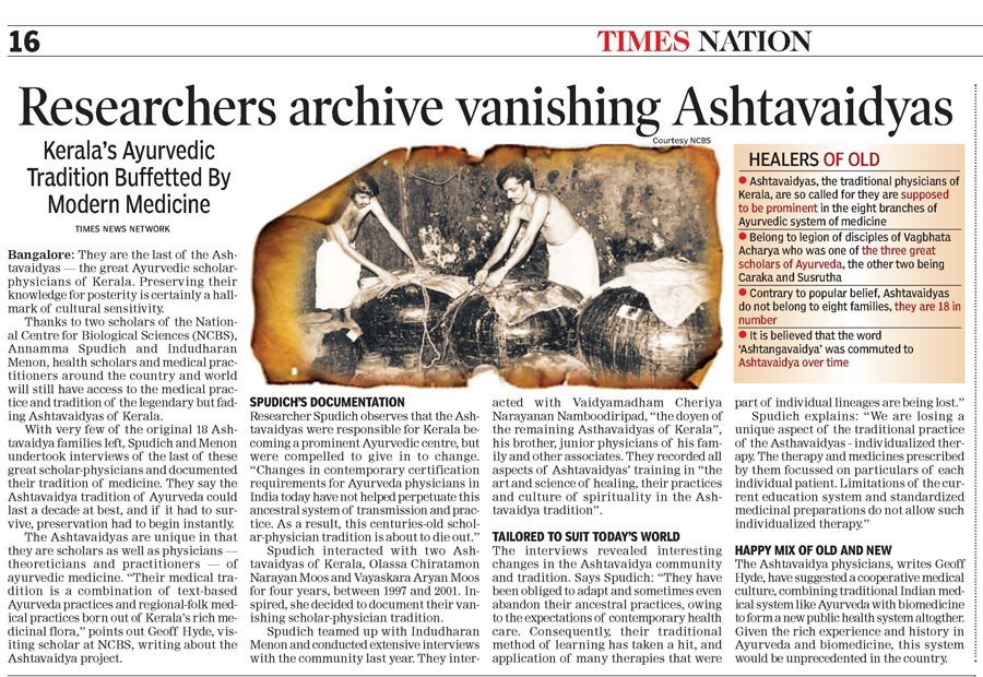 Two scientists from the National Center for Biological Sciences, Annamma Spudich, scholar in residence and Indudharan Menon are attempting to preserve Ayurveda for posterity, (employing every single aid in media communication available at this age) the great system of the Ashtavaidya Ayurvedic tradition of Kerala.